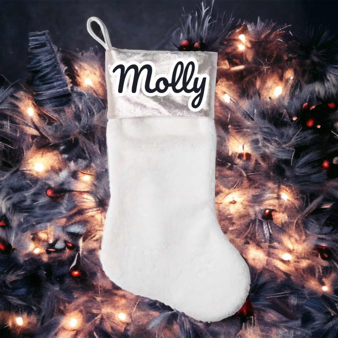 En stilren vit/silvrig julstrumpa att stoppa julklappar i.